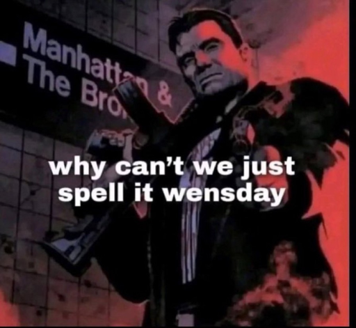 minus-squareHofmaimaier@feddit.orglinkfedilinkarrow-up1·5 days agoBut Iove spelling it wednesday, and everyone looks at me like I’m crazy, which I am…