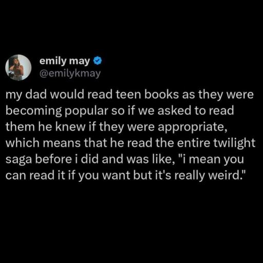 “I-I’m only reading the Twilight Saga to know if it’s appropriate for my daughter *sweats profusely* I-I don’t have a shrine to Edward in my closet!”