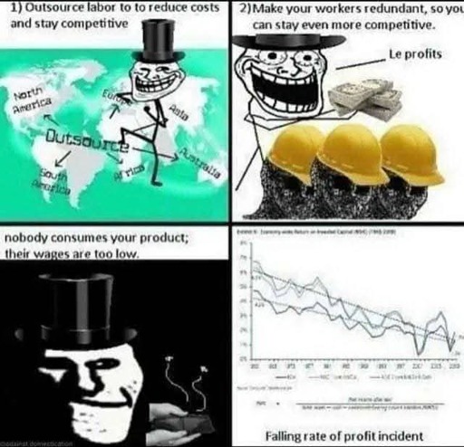Also important to note that the TRPF is largely about new machinery. Competition involves increasing technology, which raises the mass of commodities and usually the mass of profits, but lowers the rate of profit. This is only fought by further raising the mass of profits via expansion, which is why we get imperialism as capitalism grows.