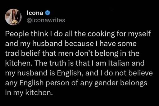 I didn’t make a value judgement on it, just saying how it usually goes, and of course I can’t account for people’s idiocy and the very Western, redpill, confused and closeted homosexual take of “we’re competitors instead of complementary, women bad because women are feminine”. I mean, my mom’s basically a brain with a mouth, she’s a lawyer who’s also a historian now because she went back to uni in her 60s, lol, and she has never, not even once, cooked us a meal. It’s just not her strong suit, it takes her 30 mins to make a cup of tea which is why my brother ended up becoming the family’s chef, and that’s fine cause she’s always brought home the bacon and paid for everything in my very comfortable childhood, maids included. 🤷